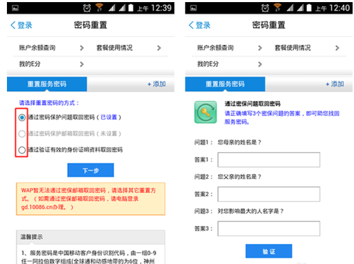 手机营业厅取回服务密码有2种方式可选:通过回答保密问题和使用身份证+三次通过记录。