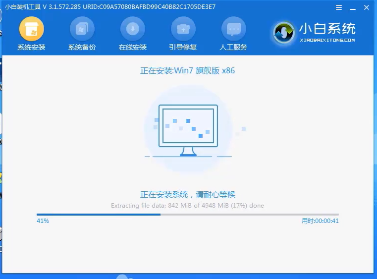 8、进入PE后无需操作,小白工具自动安装win7系统。