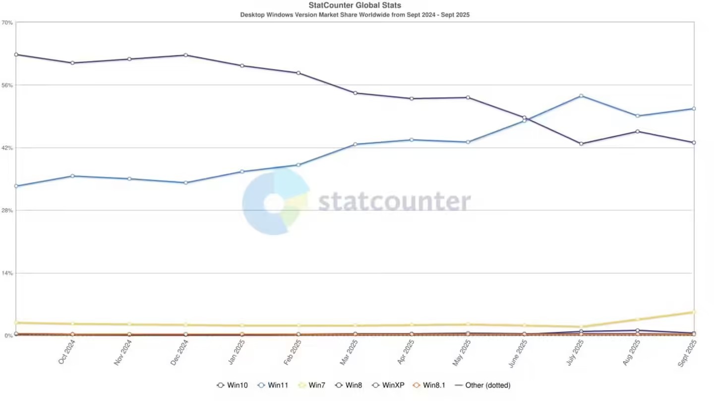 纯净之家 9 月 25 日消息,StatCounter 最新监测数据显示,微软 Win10 系统 2025 年 10 月终止支持的日期临近,很多用户都将系统版本升级为 Win11。但令人意外的是,已停止主流支持超 5 年的 Win7 系统,市场份额在近一个月内逆势激增,打破此前持续下滑的趋势。