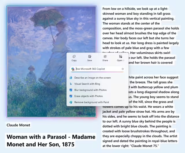 针对 Win11 AI+ PC 用户,微软深度打磨系统交互体验。首先,“Click to Do”右键菜单采用更简洁设计,在屏幕出现大图或表格后会自动弹出,方便用户快速执行复制、保存或分享等高频操作。