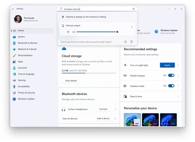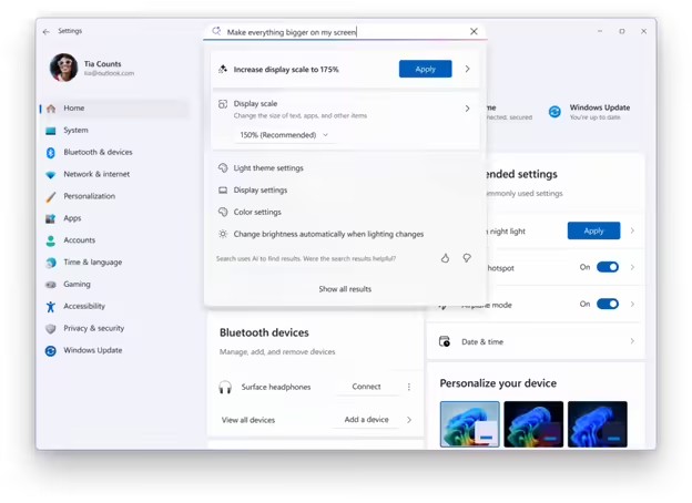 其次,新版增强“设置中智能体”(Agent in Settings)功能,用户在搜索设置项后,系统不仅会提供更多相关结果,还能直接在搜索浮窗中通过 AI 智能体调整参数。