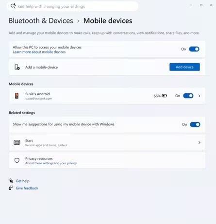 用户可以直接在 Windows 电脑的“设置”中,通过导航至“蓝牙和设备”部分下的“移动设备”来添加和管理您的移动设备。