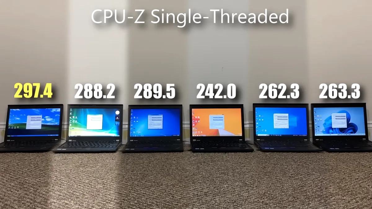 该测试选用 6 台联想 ThinkPad X220 笔记本电脑,配置为酷睿 i5-2520M 处理器、8GB 内存、256GB 机械硬盘,分别运行 WinXP、Windows Vista、Win7、Win8.1、Win10 和 Win11 的最新版本。单从这套测试设备就能看出,其测试方法本身就偏向利好旧版系统,这些硬件甚至都不在 Win11 的官方支持列表内。