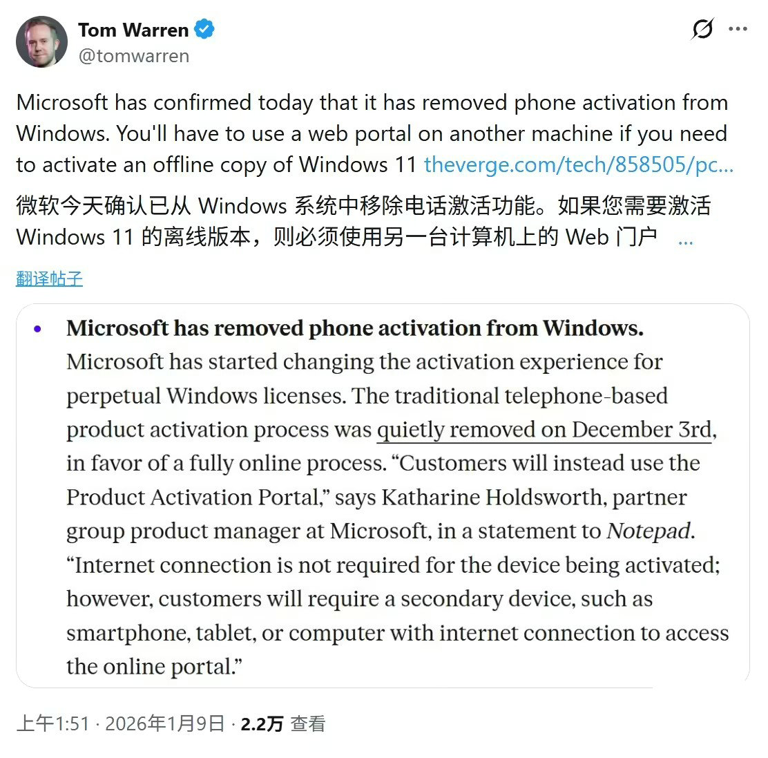 这一政策调整对旧版 Windows 系统的打击尤为严重。根据微软的说明,虽然离线激活在技术上仍然通过“第二设备”的中转方式存在,但这主要针对现行受支持的系统。对于那些早已停止支持、且依赖电话激活作为唯一合法授权途径的旧版本 Windows,官方激活现在已变得“几乎不可能”。