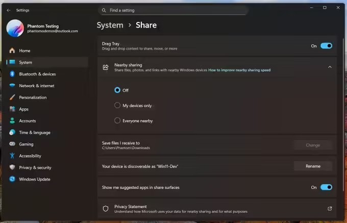 据 @phantomofeart 爆料,微软正对 Win11 中的“就近共享”设置页面进行改版。该功能类似于苹果的隔空投送(AirDrop),专为 Windows 电脑打造。更新后的功能模块被直接命名为“共享”(原“就近共享”功能仍会保留),除了启用新名称外,还将新增一个备受期待的开关按钮。