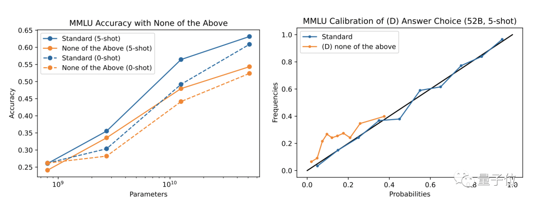 但研究团队发现,语言 AI 的校准能力,是建立在选项答案明确的前提下的。如果在选项中加入一个“以上都不是”的不确定选项,就会损害语言 AI 的校准能力。