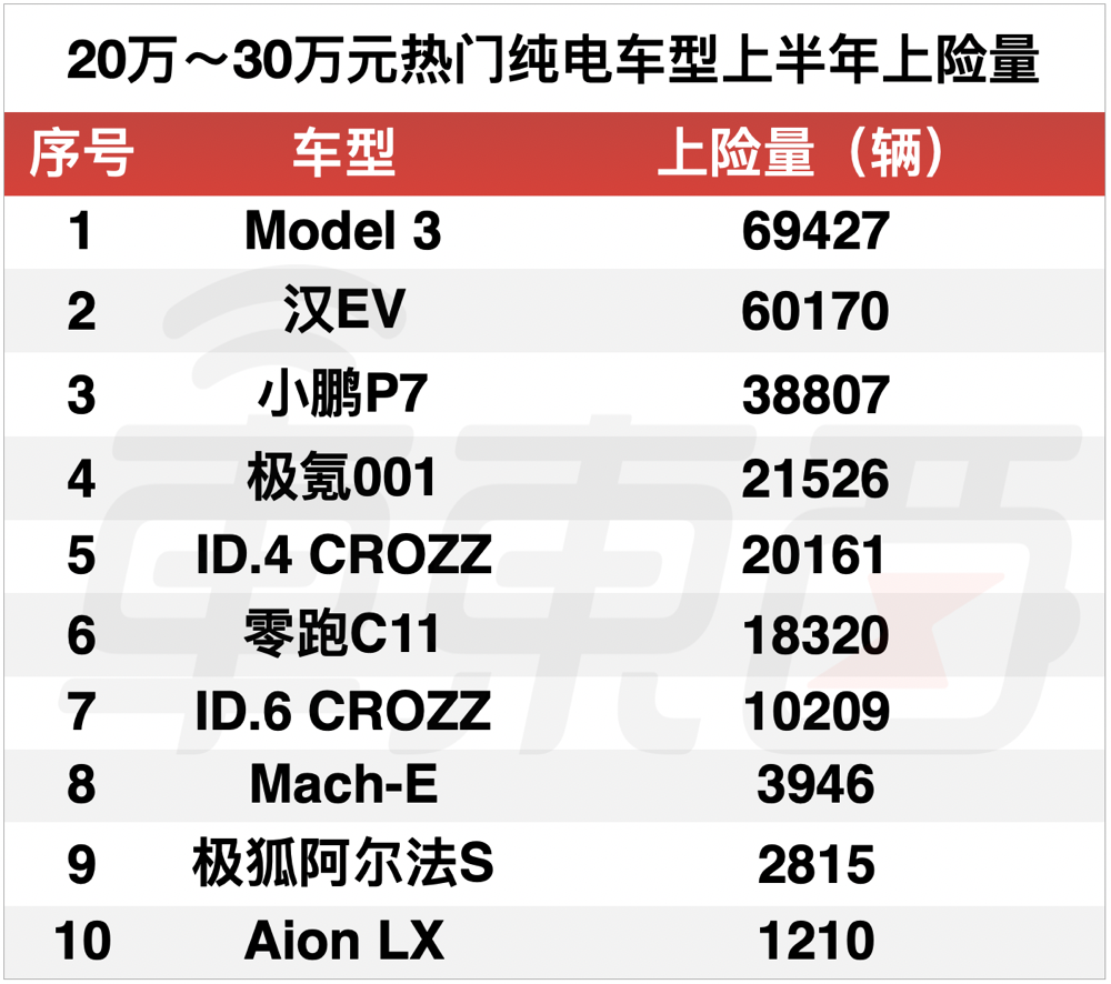 对比来看,在 20~30 万元热门纯电车型上半年上险量榜单里,特斯拉 Model 3 和比亚迪汉 EV 上险量都破了 6 万辆,比第三名小鹏 P7 的 3 万多辆几乎多了一倍。