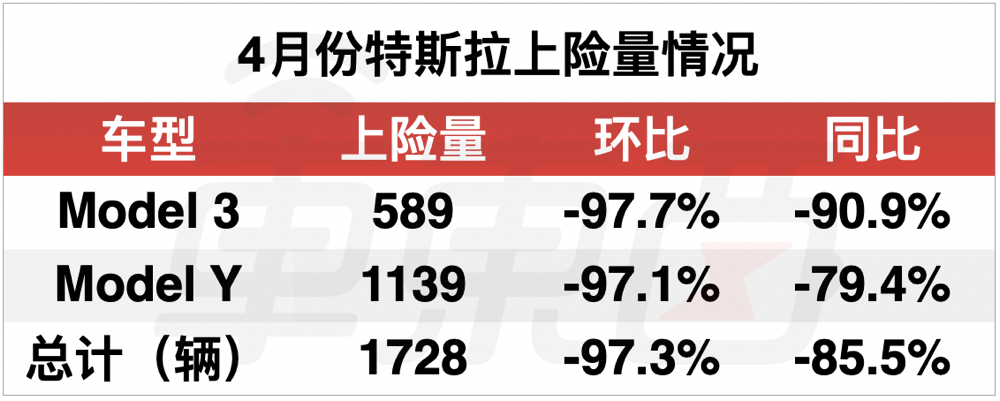 要知道,特斯拉今年 3 月份受到上海疫情影响,工厂停工,4 月的交付量非常惨淡,最畅销的车型 Model Y 的上险量为 1139 辆,环比下降了 97.1%,同比下降 79.4%,下降幅度非常明显。而另一款车 Model 3 的情况就更惨了,上险量仅有 589 辆,环比和同比下降幅度都超过 90%。