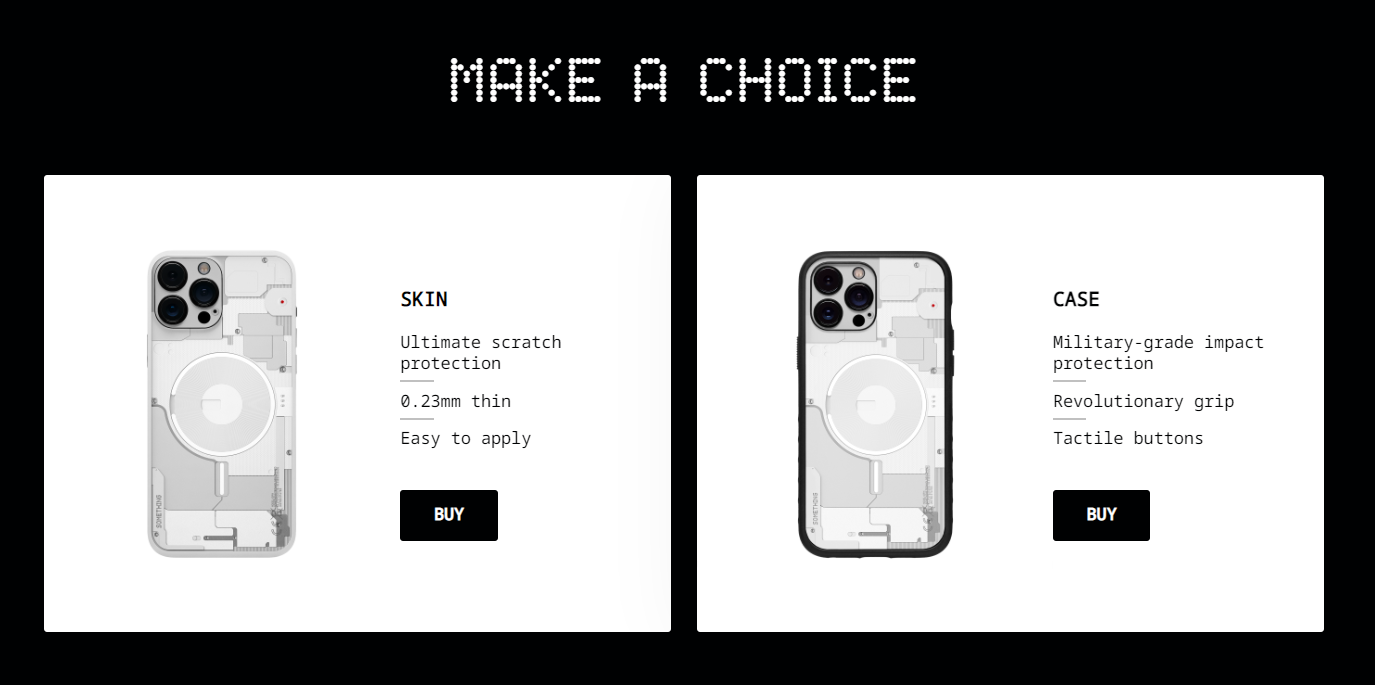 Dbrand 为多款手机推出了类似 Nothing Phone (1) 后盖的贴纸、保护壳,还很恶搞的起名叫“Something”,甚至模仿了 Nothing 官网的排版。
