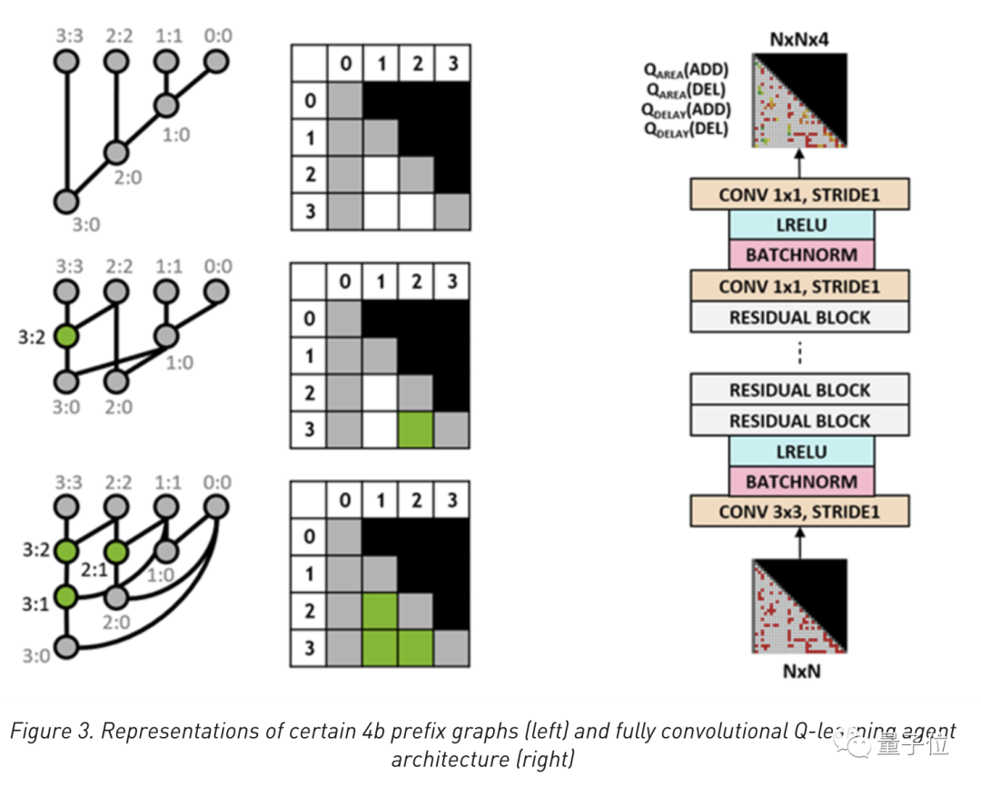 研究人员使用 Q-Learning 算法来训练 agent。首先将前缀图表示成网格,网格中的每个元素都映射到电路中的节点。输入和输出均为网格,只不过输入网格中的每个元素表示节点是否存在,输出每个元素则表示用于添加或删除节点的 Q 值。