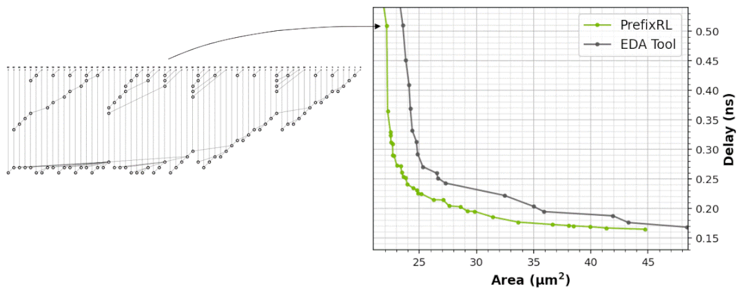 结果显示,在相同延迟、效能下 PrefixRL 加法器面积比 EDA 工具加法器面积减少了 25%。