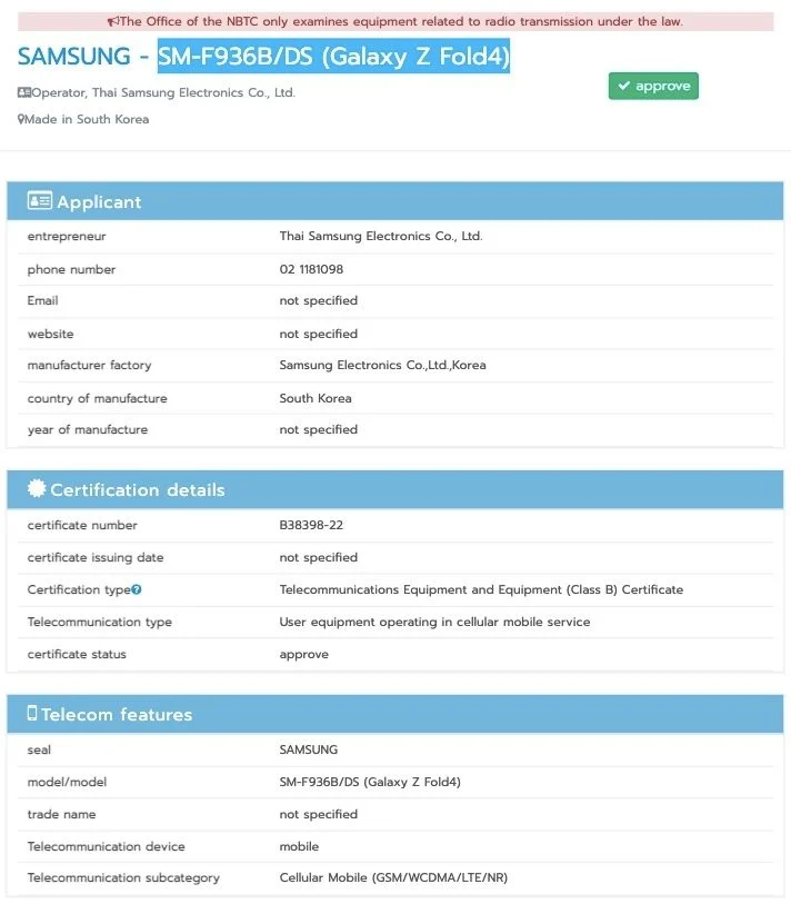 小编曾报道,三星 Galaxy Z Fold 4 和 Galaxy Z Flip 4 上周通过了 FCC 认证,而且数天后也已通过 NBTC 认证。