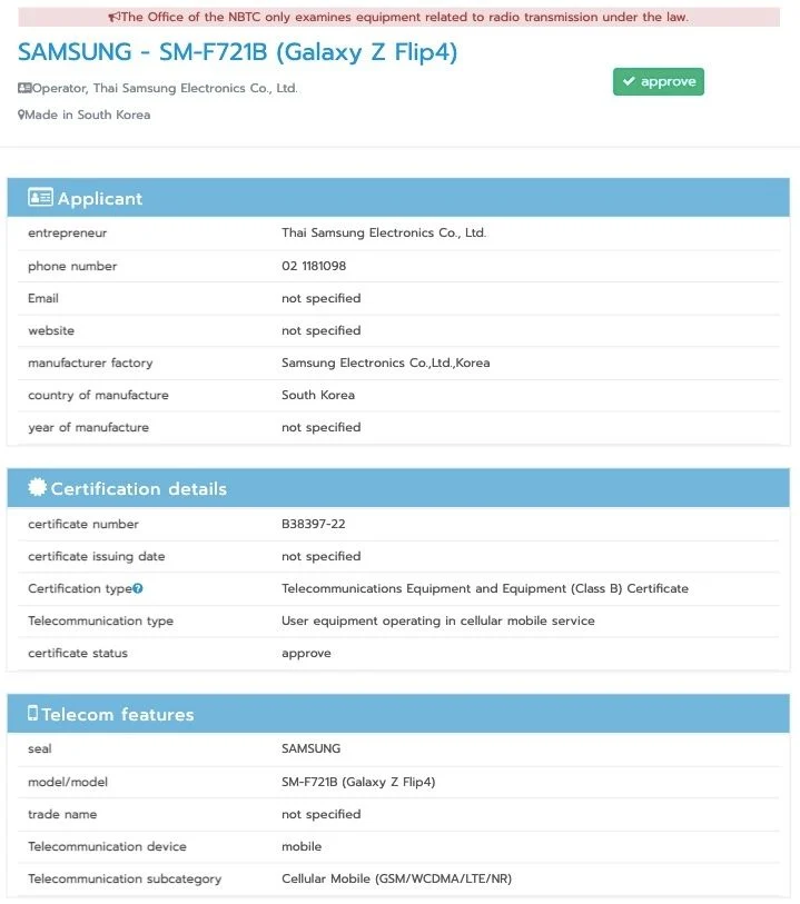 其中,Galaxy Z Fold 4 的 NBTC 认证型号为 SM-F936B / DS,Galaxy Z Flip 4 则为 SM-F721B。