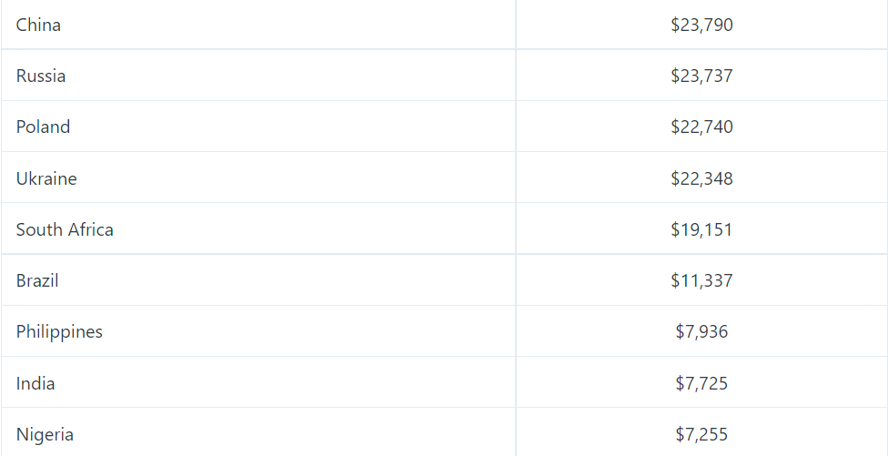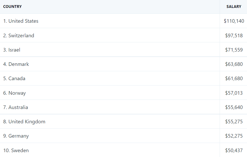 据统计,2022 年薪资最高的三个国家为:美国、瑞士和以色列。此外,丹麦、加拿大、挪威、澳大利亚、英国、德国和瑞典位列前十。