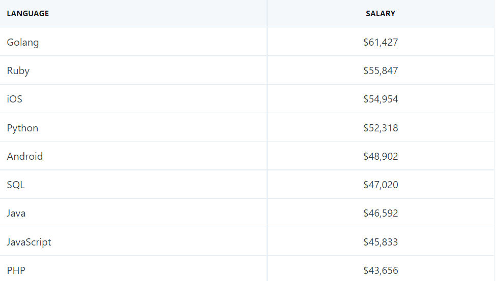 排名最后的是 PHP,平均年薪为 43656 美元(约 29.56 万元人民币);稍高一些的是 Javascript,平均年薪为 45833 美元(约 31.03 万元人民币)。