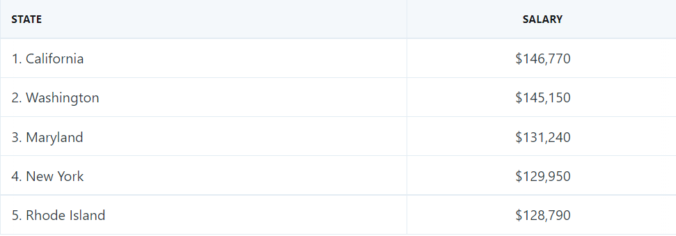 再来看薪资最高的美国,美国软件开发者的平均年薪为 110140 美元(约 74.56 万元人民币)。按地区来看,加利福尼亚州是软件开发者收入最高的州,毕竟是硅谷所在地,平均年薪为 146770 美元(约 99.36 万元人民币),华盛顿州排名第二,马里兰州排名第三。