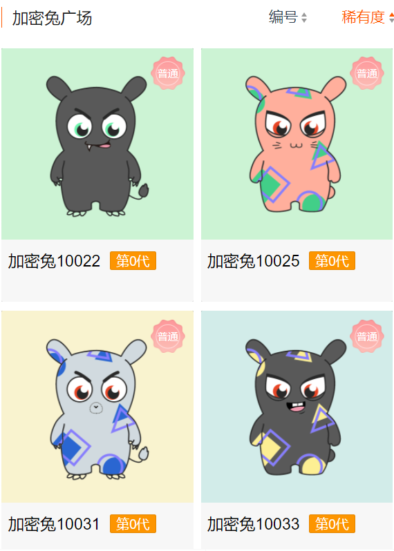 加密兔含有稀有基因的数量和类型将决定 TA 的等级,你的加密兔可能是【传说】、【史诗】、【罕见】、【稀有】、【普通】中的任何一个等级。