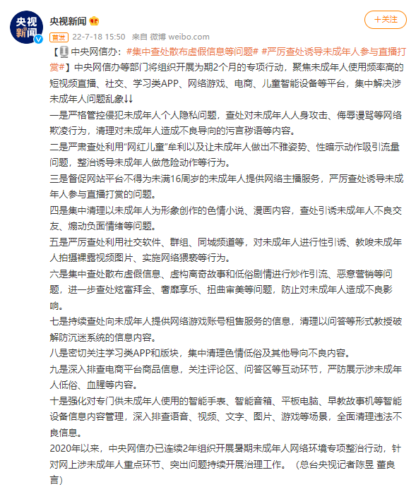 中央网信办:集中查处散布虚假信息等问题,严厉查处诱导未成年人参与直播打赏