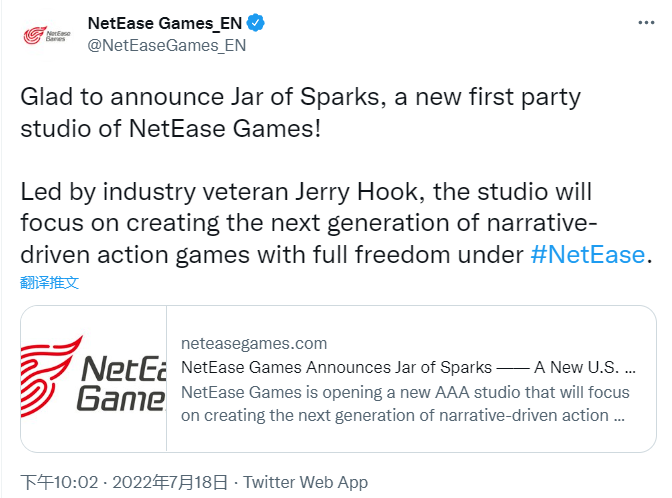 小编 7 月 18 日消息,网易网络游戏部门网易游戏宣布,正在开设一个新的 AAA 工作室 Jar of Sparks,将专注于创造下一代叙事驱动的动作游戏。