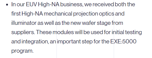 ASML 公告还透露,公司的 EUV 高 NA 业务中,已收到了来自供应商的第一台高 NA 机械投影光学器件、光源以及新的晶圆载物台。这些模块将用于初始测试和集成,这是 EXE:5000 程序的重要一步。