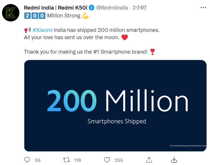 小编 7 月 20 日消息,小米 Redmi 印度官推宣布,小米已在印度出货 2 亿部智能手机,达成了新的里程碑。