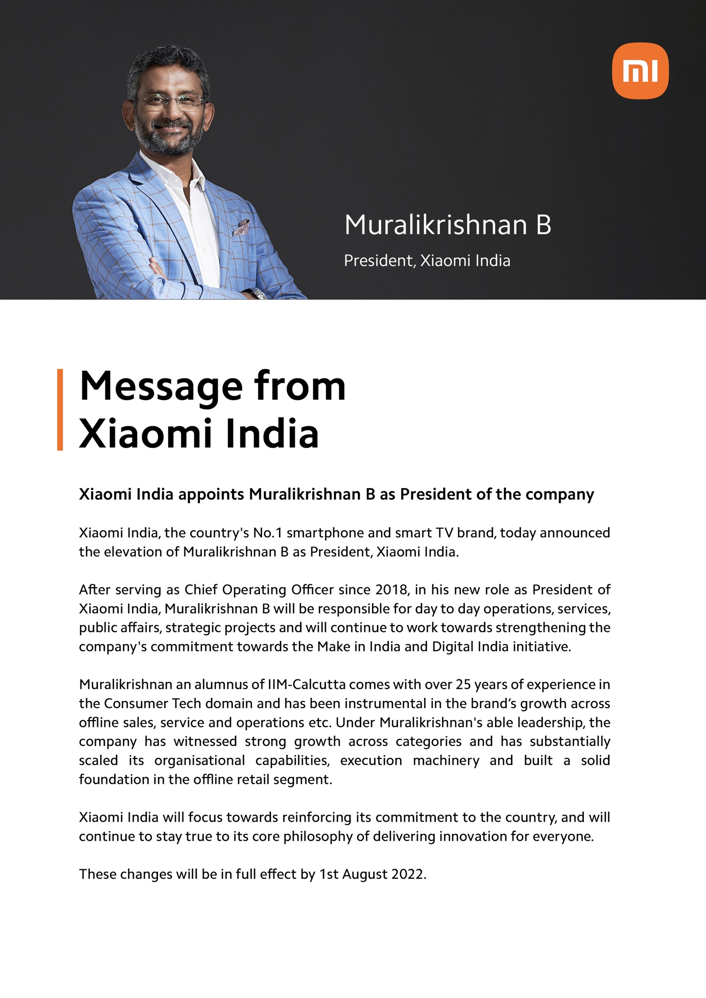 7 月 15 日,小米印度公司宣布了新的负责人,擢 (zhuó) 升首席运营官穆拉里什南为公司总裁,其将负责日常运营、服务、公共事务及战略项目。这一任命将于 2022 年 8 月 1 日生效。