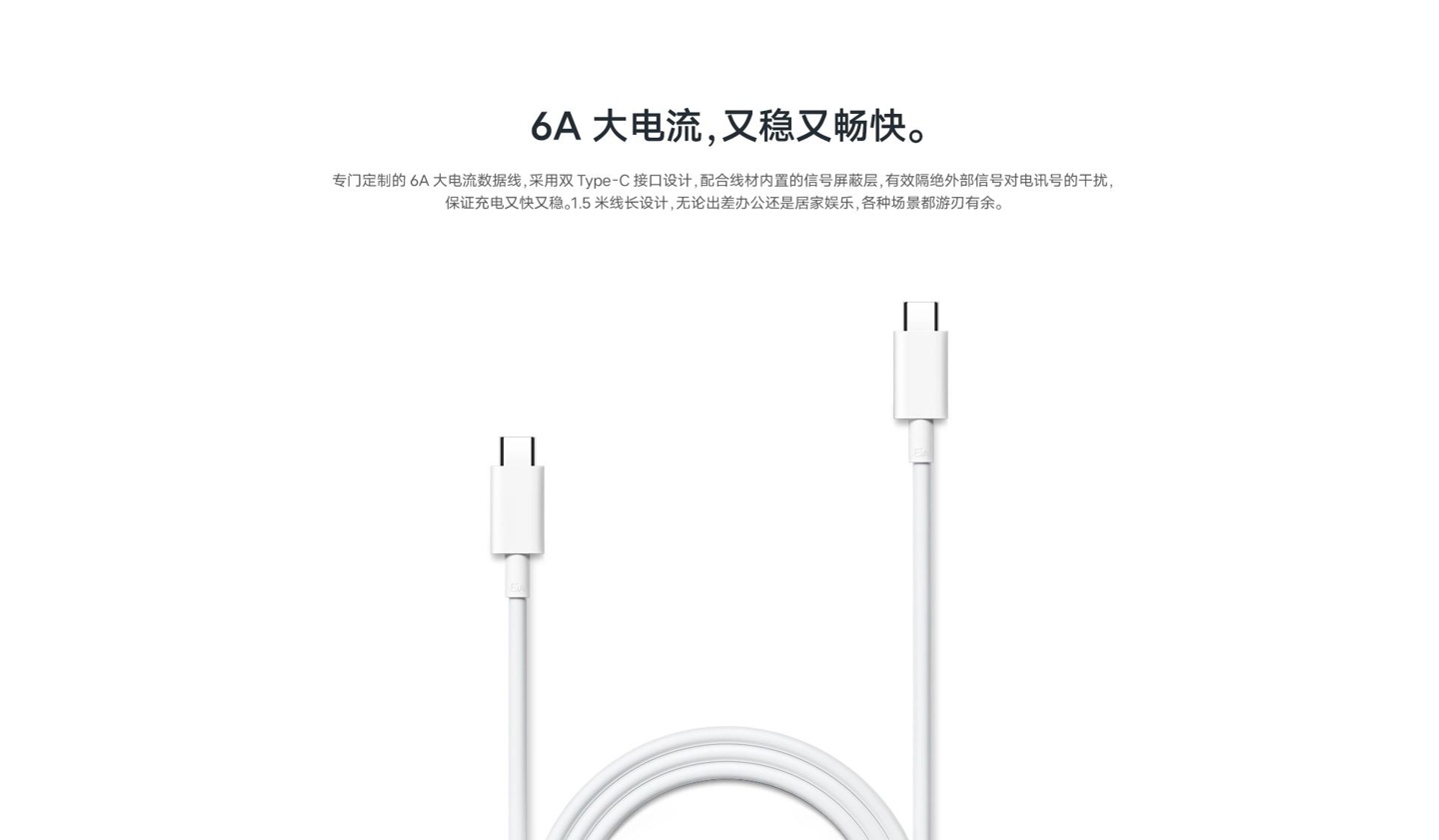此外,该充电器定制了 1.5 米长的 6A 大电流数据线,采用双 Type-C 接口设计,配合线材内置的信号屏蔽层,有效隔绝外部信号对电讯号的干扰。