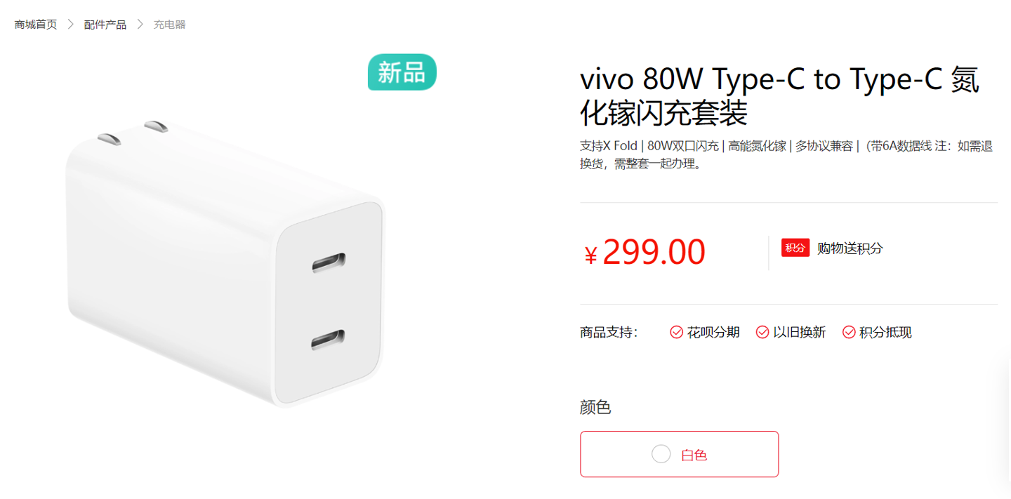 近日,这款充电器在 vivo 官方商城单独开售,价格为 299 元,已经可以购买了。