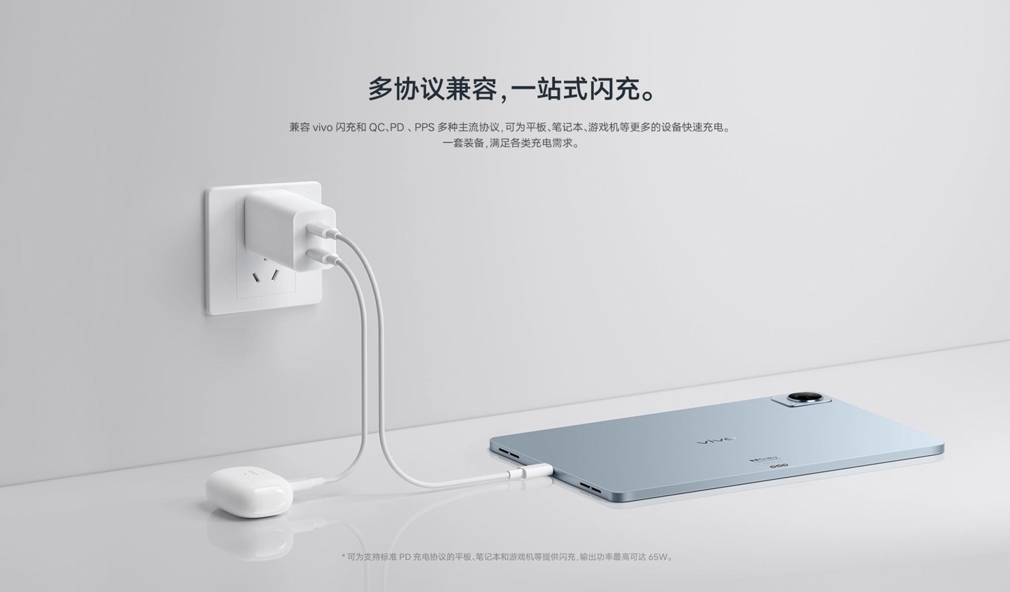 小编了解到,该充电器任意单口输出功率最高可达 80W;双口同时充电,支持 60W Max+20W Max 和 40W Max+40W Max 两种功率输出,兼容 vivo 闪充和 QC、PD、PPS 多种主流协议,可为平板、笔记本、游戏机等更多的设备快速充电。