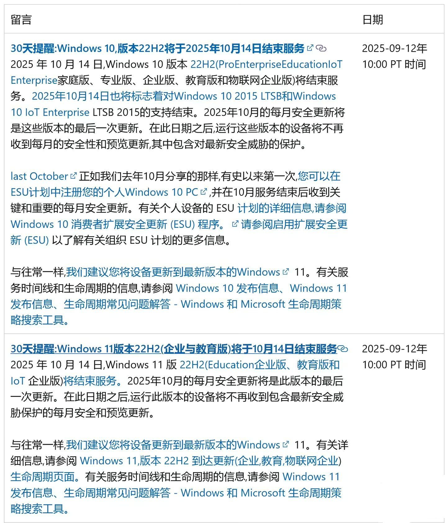 微软表示,10 月份例行的安全补丁将是这些版本可以接收的最后一次更新。此后,运行这些系统的设备将无法获得最新安全威胁的防护补丁。微软建议符合条件的用户升级至 Windows 11,或通过 Windows 365 迁移至云端 Windows 11,以确保持续获得安全更新和功能维护。