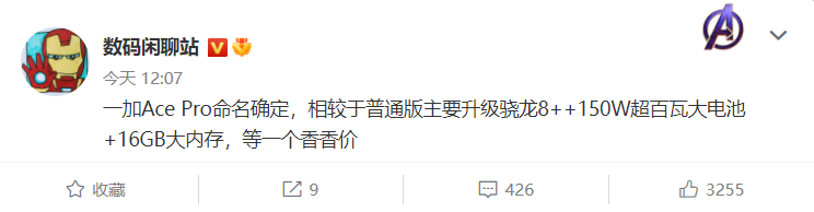 微博博主 @数码闲聊站 称,“一加 Ace Pro 手机名称已经确定,配置方面将搭载骁龙 8+ Gen 1 芯片,相较于普通版主要升级搭载了骁龙 8+Gen 1 芯片,还有 150W 超百瓦大电池、16GB 大内存,另外价格方面可能有惊喜。”