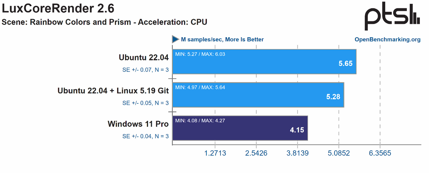 而在 LuxCoreRender 基于物理的渲染 (PBR) 测试中,更新到 Linux 5.19 内核的 Ubuntu 22.04 LTS 没有任何改进,甚至性能略有下降。