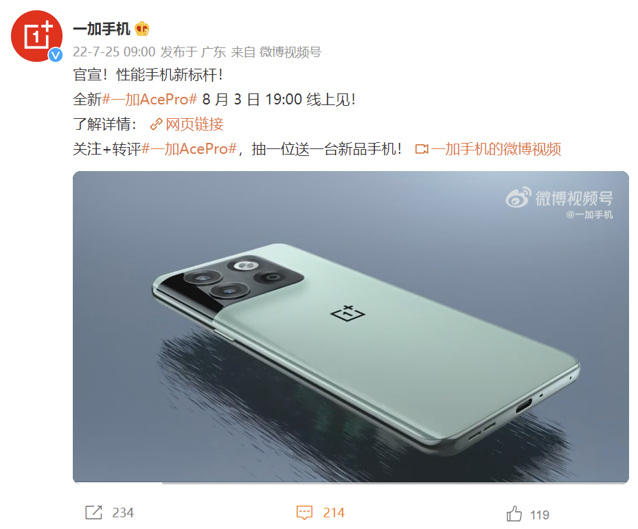 小编 7 月 25 日消息,今日上午,一加手机官方宣布,一加 Ace Pro 新品发布会将于 8 月 3 日 19:00 召开,宣传语为“性能手机新标杆”。届时,全新一加 Ace Pro 将正式亮相。