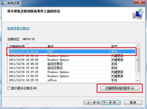 3、最后只要选择最近手动设置过的还原点以及其他自动的还原点都可以,但是最好下一步之前点击“扫描受影响的程序”按钮。