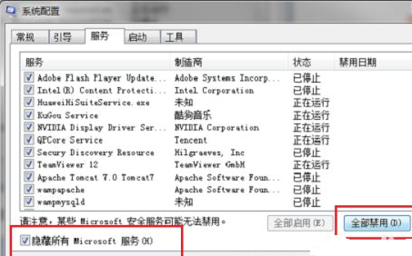 4、勾选上下方的“隐藏所有Microsoft服务”,然后勾选上所有服务点击“全部禁用”。