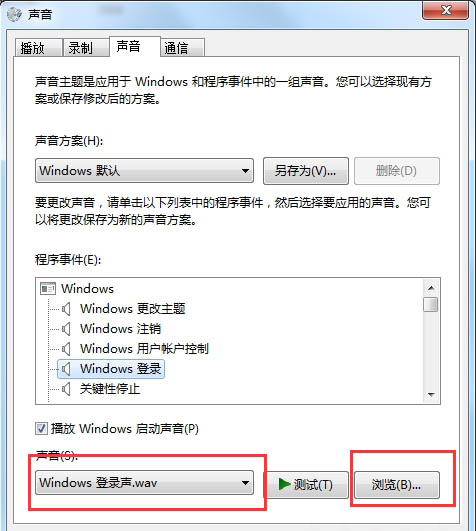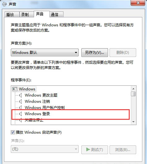 2、在打开的“声音”面板上,切换至“声音”选项卡下,选择“Windows登录”,然后再选择“Windows默认”。