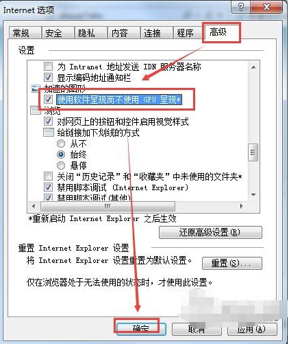 2、点击高级---将“加速的图形”下面的"使用软件呈现而不使用GPU呈现*”前面的选择框勾上,点击确定。