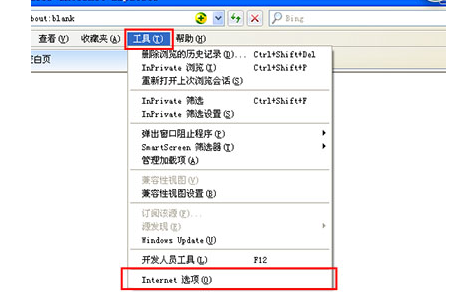 第二步:选择IE 菜单栏-工具菜单-Internet选项。