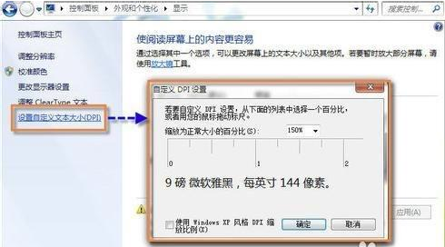 5、单击“显示”窗口左侧导航栏上的“设置自定义文本大小(DPI)”文字链接,弹出“自定义DPI设置”窗口,打开“缩放为正常大小的百分比”右侧下拉框,可以将DPI文本大小设置为正常大小的 100%、125%、150%、200%等四个标准;
