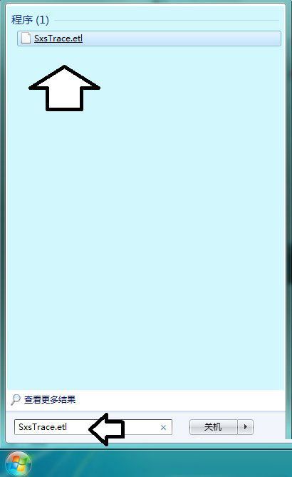 6、在开始菜单搜索框中输入:SxsTrace.etl文件名就可以找到该文件,查看出错缘故等信息;