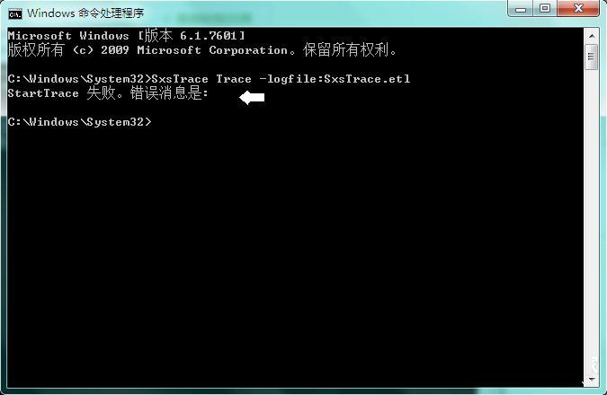 3、假如输入追踪的命令:SxsTrace Trace -logfile:SxsTrace.etl 以后,弹出这种提醒:SxsTrace 不成功。不正确的信息是:有可能是操作系统并没有相对应权限的原因;