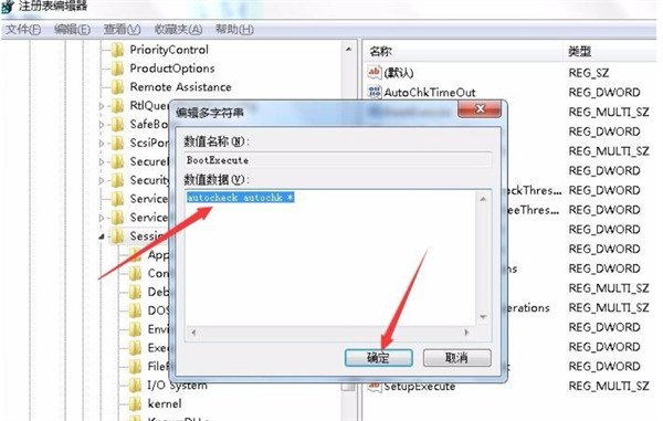 3、将数值数据设置为autocheck autochk *,设置完成后点击确定,关闭窗口即可。如果以后电脑出现蓝屏,电脑重启后自动运行自检程序,视图对系统中存在的错误进行修复。