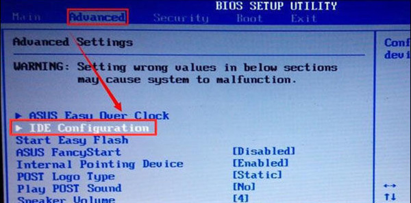 1、在进入到开机启动的页面时,按f2进入bios主界面后,按方向键找到【advanced】,再进入的子菜单中使用方向键选择【ide configuration】按回车打开启动设置。