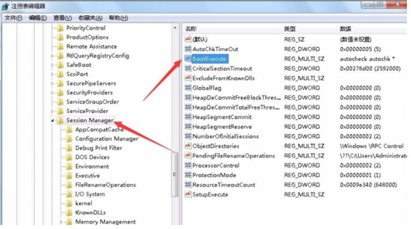 2、打开注册表编辑器,依次展开以下路径HKEY_LOCAL_MACHINE\SYSTEM\CurrentControlSet\Control\Session Manager,然后在右侧找到并双击BootExecute项。