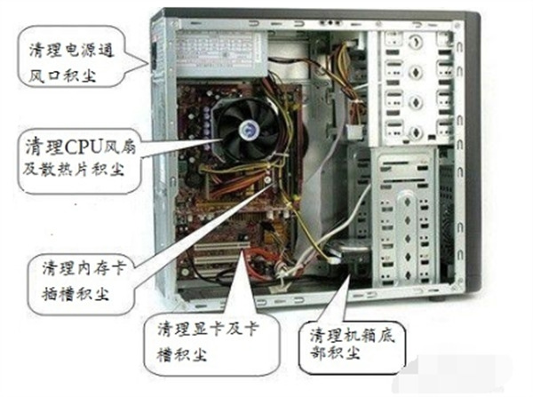 2、也可以检查机器的散热风扇是否运转正常,然后打开机箱后盖!以便于散热。同时用电吹风清理机箱内的灰尘。