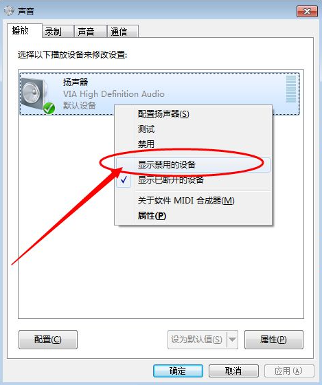5、此时若没有查看到耳机设备的,选择扬声器单机鼠标右键,点击显示禁用的设备。