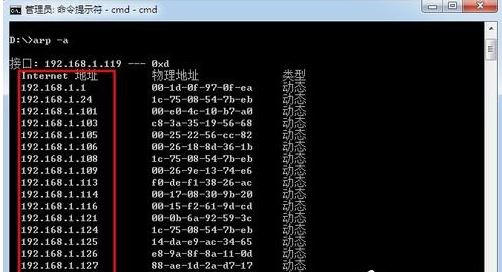 5、该命令可返回本机IP地址信息,如下图所示。查看局域网中的其他计算机IP地址。