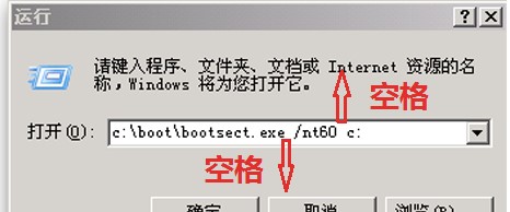 3、开始菜单中运行“c:\boot\bootsect.exe /nt60 c:” 回车。