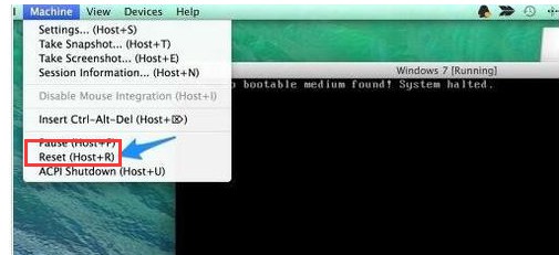 接下来我们在 Mac 系统的顶部 Virtual Box 的 “Machine” 菜单中,点击“Reset”选项(也可按键盘上的 command+R 键),重新启动虚拟机;