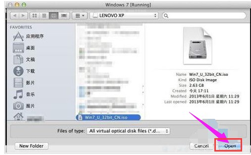 在弹出的选择镜像文件窗口中,选择我们之前准备好的 Windows 7 镜像 iSO 文件,点击“打开”按钮;